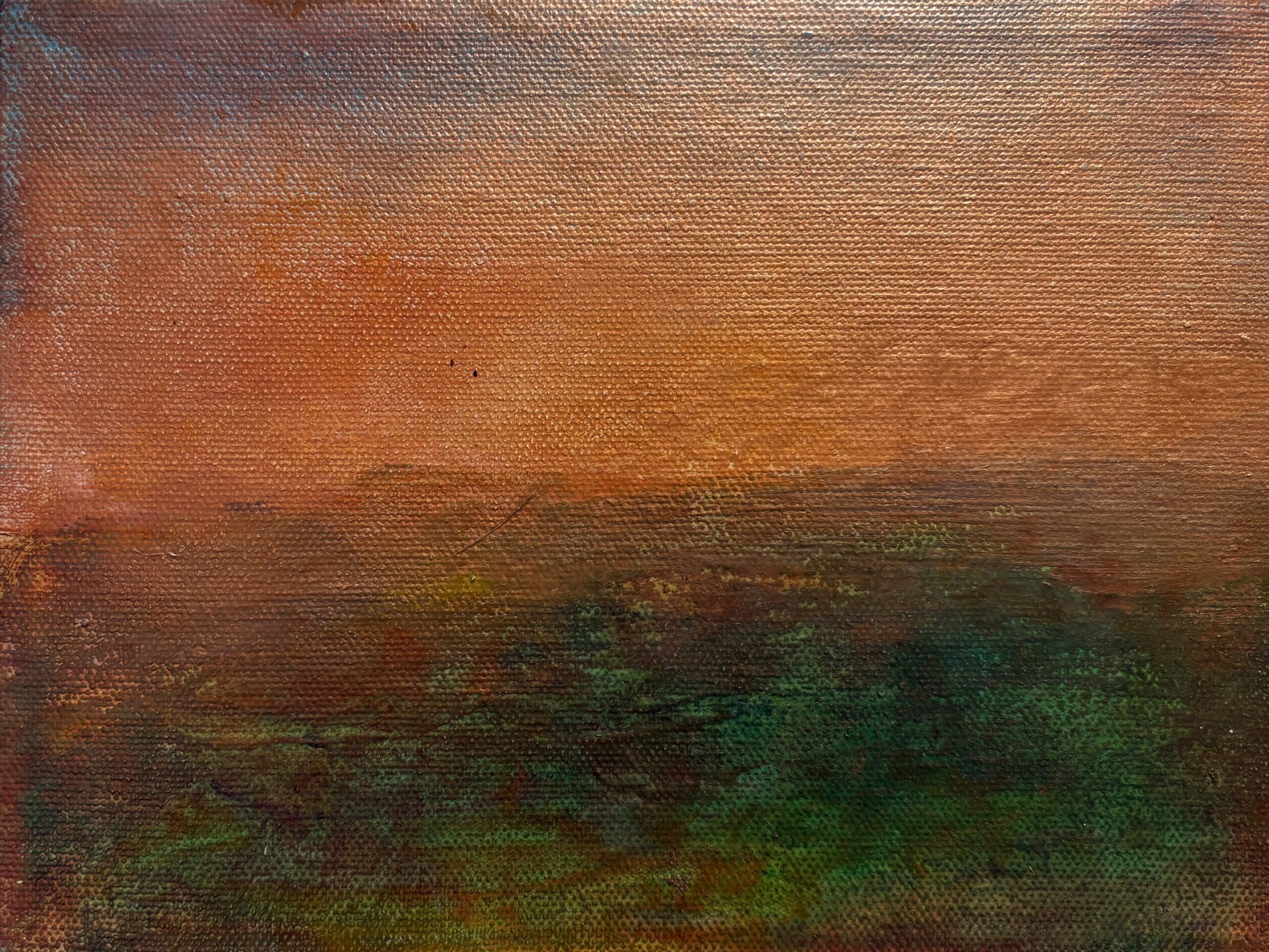 Warm atmospheric landscape in copper and earth tones; textured, quiet dusk mood.