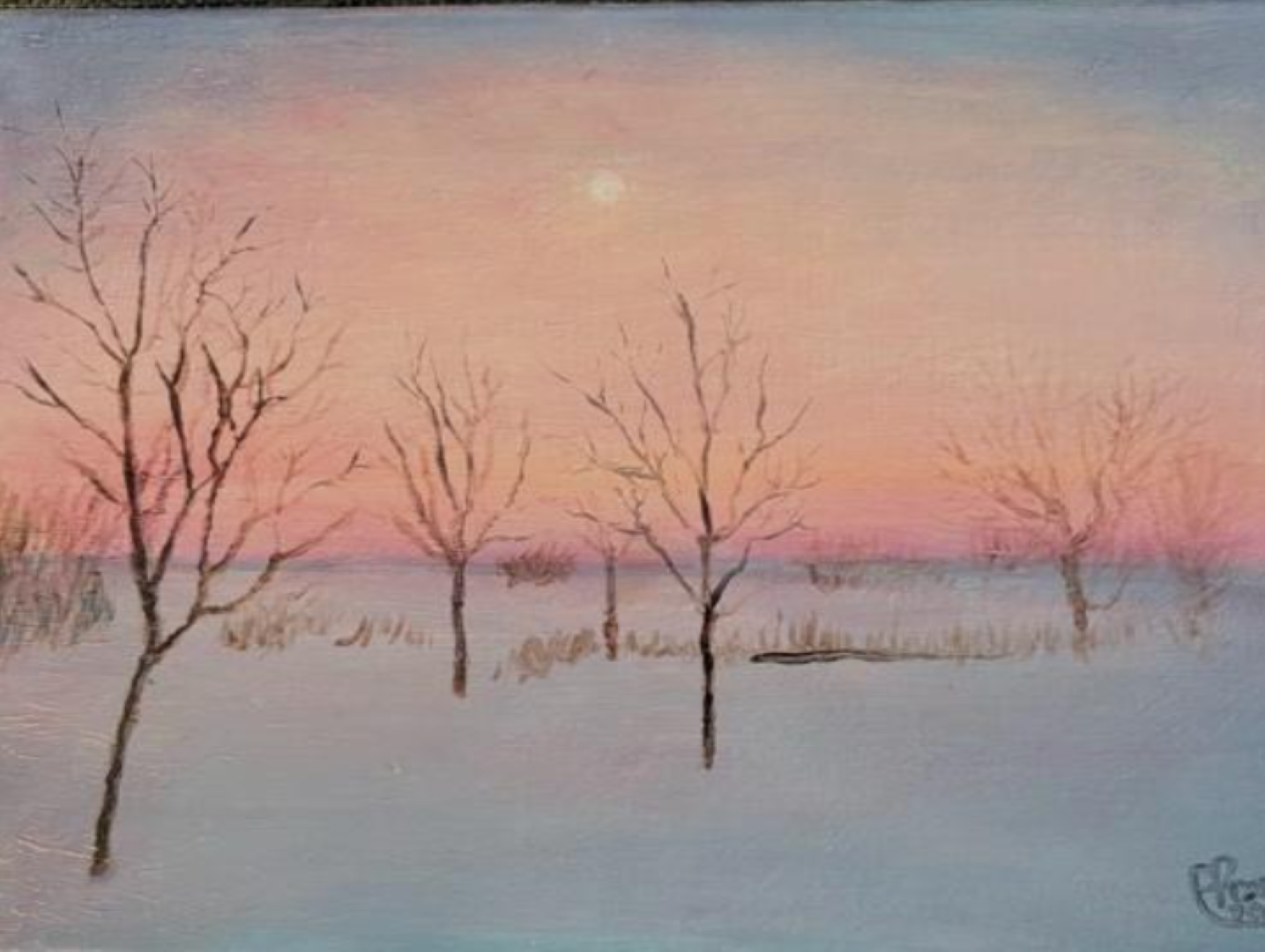 Winter river at sunset; soft pinks and blues; calming atmosphere.